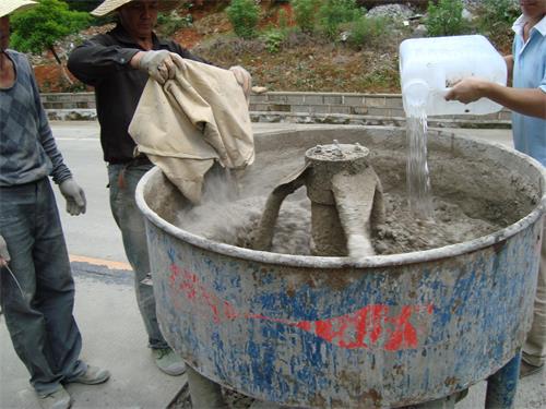 根據(jù)修補(bǔ)區(qū)域面積計算所需修補(bǔ)材料用量(以單塊路面板為單位計算),盡量做到一次性鋪裝。鋪裝工序及坑槽充分吸水飽和且無明水時進(jìn)行材料攪拌。用攪拌機(jī)先干拌SC型修補(bǔ)料和干凈碎石,修補(bǔ)料與碎石質(zhì)量比為1:0.8/1(碎石是直徑在10-30㎜連續(xù)級配石子,還要經(jīng)水清洗過),攪拌均勻后,再加干凈的水?dāng)嚢瑁铀恳詸z測報告提供的數(shù)據(jù)為依據(jù),直至攪拌均勻。觀察無干粉球和氣泡,如果仍有干粉球和氣泡,可靜止一分鐘后再攪拌,攪拌時間在3-5分鐘左右為宜,不宜時間過長,防止材料在攪拌機(jī)內(nèi)凝固。注意控制好水灰比,攪拌好的修補(bǔ)料不得泌水。